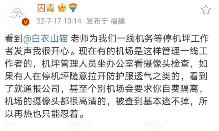 微博上的机务大v囚青最近就发了一条微博说:“现在有的机场是这样管理一线工作者的:机坪管理人员坐在办公室看摄像头检查,如果有人在停机坪随意拉开防护服透气之类,看到了就通报公司,甚至个别机场会要求你自费隔离。”