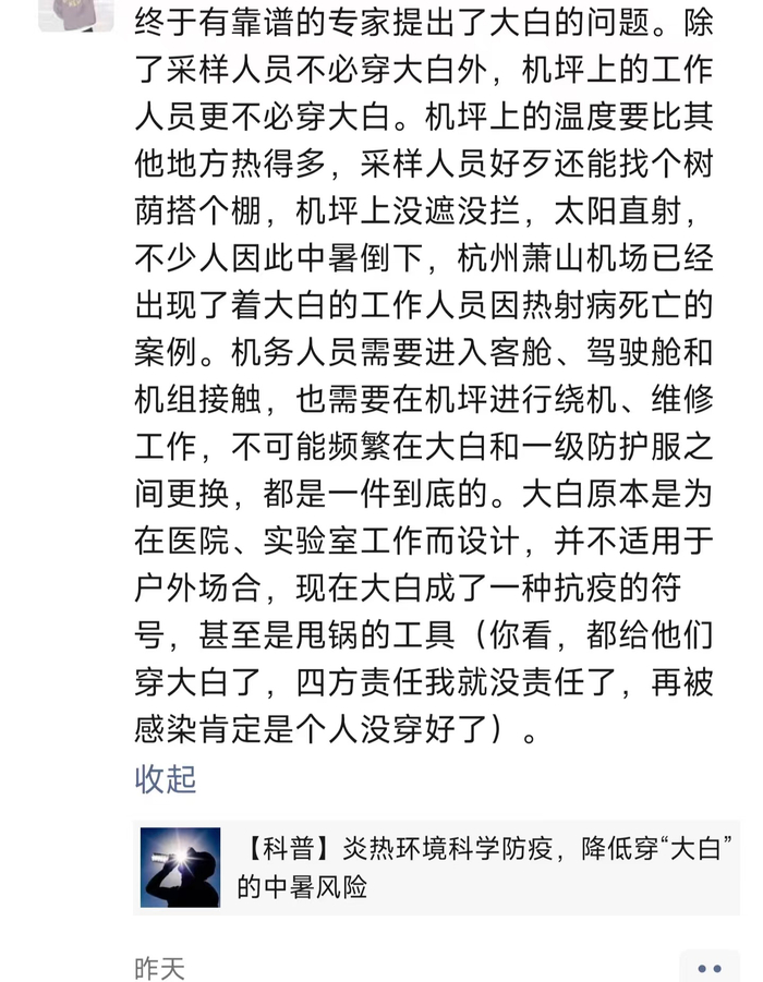而就在几天前,复旦大学附属华山医院感染科主任张文宏团队刚刚发文提示:在炎热的环境中,继续穿着“大白”会阻止人体热量的散发,大大增加中暑发生的概率。事实上,被汗水浸透的“大白”防护作用也已经大打折扣。