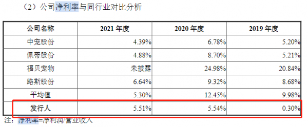 乖宝宠物对此解释称,“公司与贝公司的净利率差异主要为产品结构差异及销售费用投入差异;与中宠股份、佩蒂股份和路斯股份的差异主要为销售费用差异;公司国内自有品牌收入占比较高,故营销费用较高。”