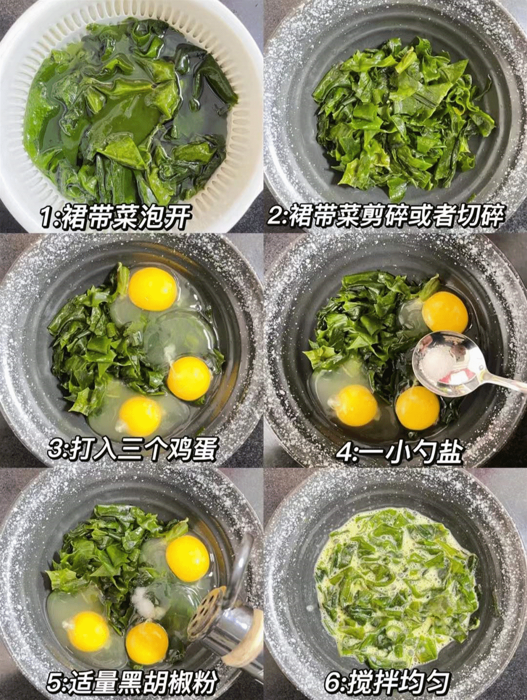 裙带菜泡开剪碎+3个鸡蛋+1勺盐,