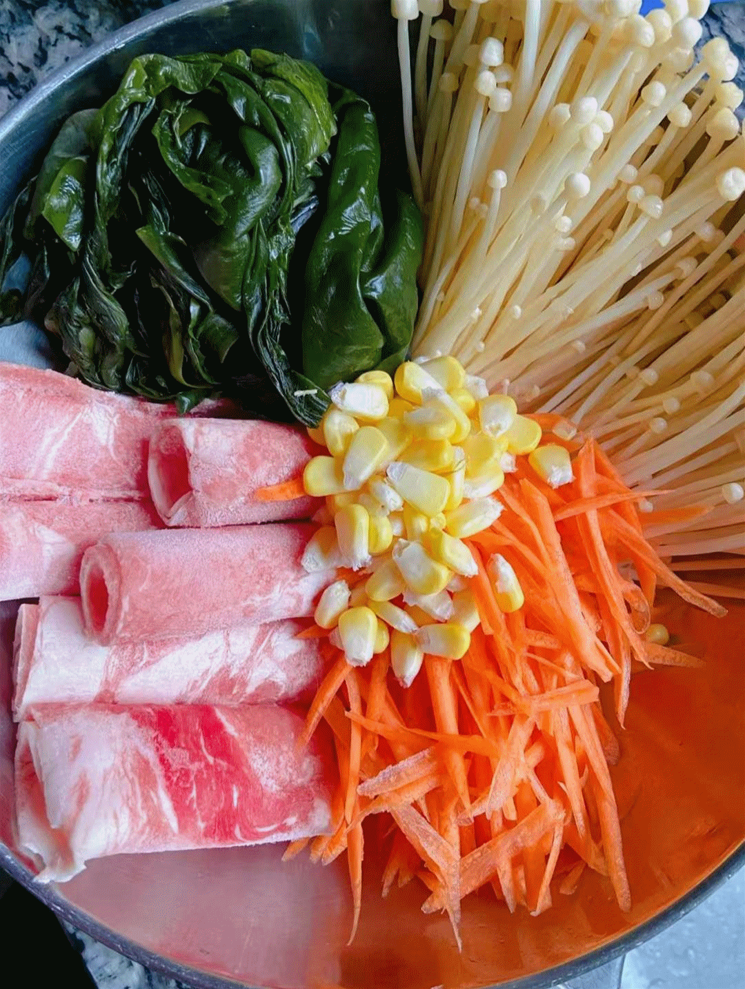 加入鸡蛋、牛肉卷、豆芽等调制,