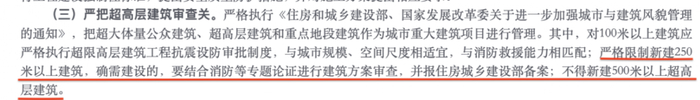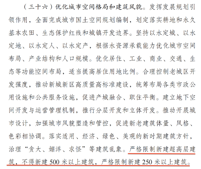 今年7月12日,发改委公开了《国家发展改革委关于印发“十四五”新型城镇化实施方案的通知》,通知中明确指出,严格限制新建超高层建筑,不得新建500米以上建筑,严格限制新建250米以上建筑。