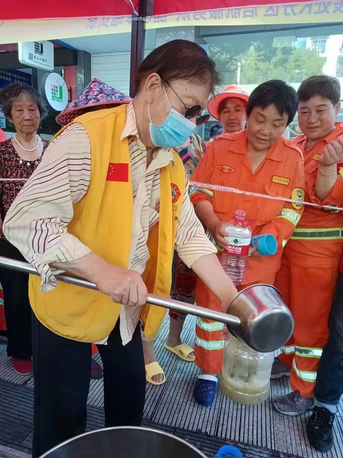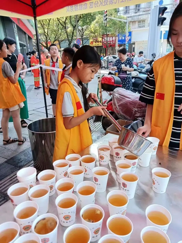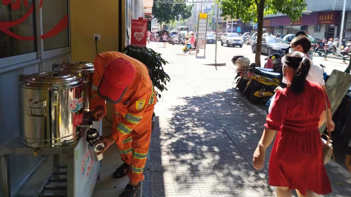 凉茶是6月初开始准备的,10号开始,每天24小时提供凉茶,分上午和晚上2批。看到环卫工人、路人拿着水壶来喝凉茶,我们的志愿者也挺开心的,有些环卫工人一天要喝两大瓶凉茶,说府前黄金地段能出现免费凉茶挺意外的。