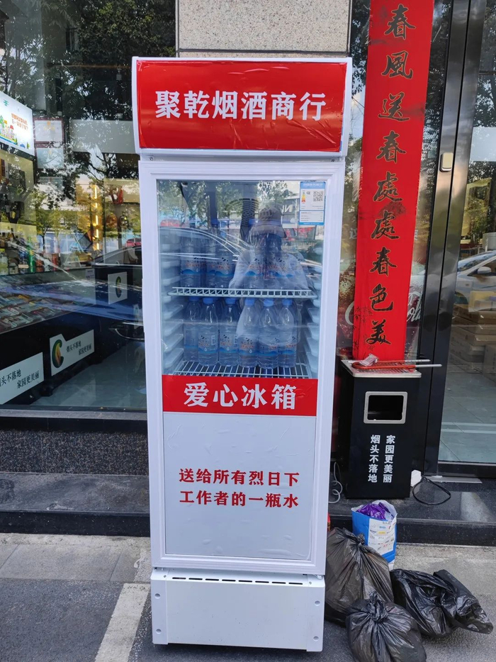 今年的温度比往年都要高,在室外工作确实比辛苦,因为我也经常会到室外送送货,走走业务,所以就自己去买了台冰箱放在外面,给大家提供方便吧。