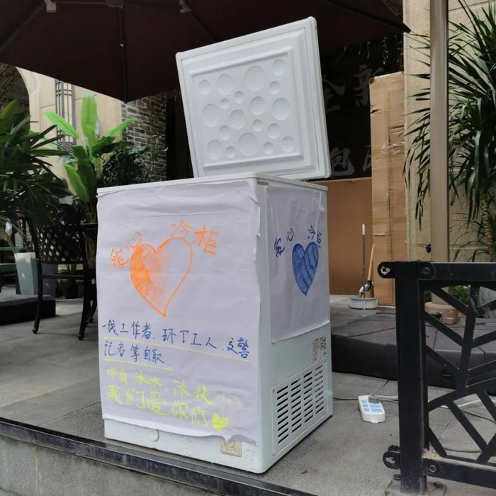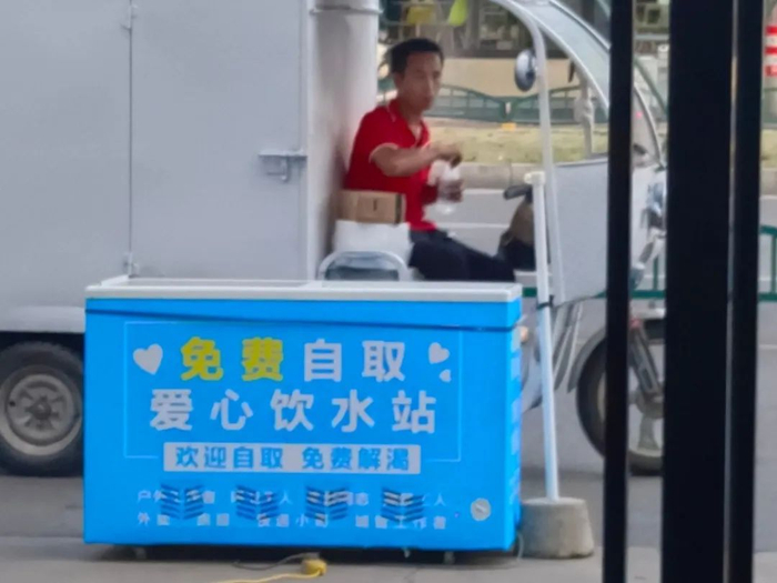 我自己也会送货,有时候没带水,口渴地厉害,深深地感受到在户外工作人员的辛苦。冰箱放门口的时候,也会有很多好心人来补充水的库存,这个事挺好的!