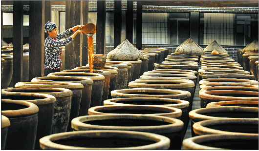 酿醋房中摆放着几百口醋缸,侯沅坪从缸中舀起满满一瓢尚未加工成的纯醋,然后,让其瀑布般顺势而下,酸味弥漫开来。