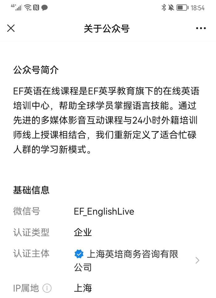 证券时报记者查阅发现,被盗用的“上海英培商务咨询有限公司”此前运营EF英语在线课程公众号,称是英孚教育旗下的在线英语培训中心。