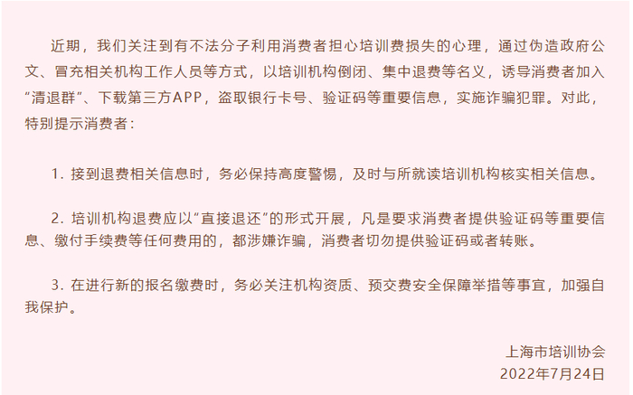 7月24日傍晚,上海市培训协会发布风险提示公告,提醒消费者接到退费相关信息时,务必保持高度警惕,及时与所就读培训机构核实相关信息。