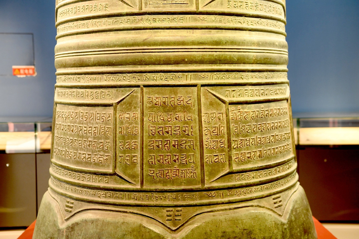 除了不同凡响的规格外,钟身上雕刻的各种铭文和纹饰更吸引了无数参观者驻足。“上面的信息太丰富了,就像是留给后人的谜题。”一位参观者说。这口神秘大钟钟身分为三层,每一层都刻有汉文、藏文、梵字经文等铭文。汉字铭文出现在钟身的第二层,四周分布着精美的纹饰。其中,“大明景泰年御用监太监尚义发心铸造”揭示了铜钟的铸造年代和铸造者,而“皇图永固”“帝道遐昌”“佛日增辉”等铭文流露出了当时的统治者对于江山永固的向往以及对佛教思想的推崇。