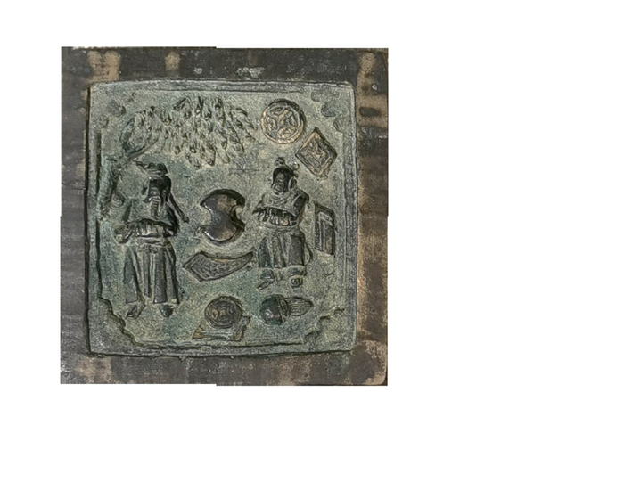 馆内展出的一面宋代的方形铜镜,名为锭纽武士纹方铜镜。据了解,这面铜镜是1993年两位学生在梨园镇北三间房村游玩时,于废弃的工地上捡到的。相较于常见的圆形,这面铜镜四四方方,边长均为8.5厘米,厚0.3厘米。镜背中心有银锭纽,纽两侧各有一名武士。镜背面左侧还有一株树,树旁边还雕刻了古钱等纹饰。器形俊俏别致,纹饰活灵活现。