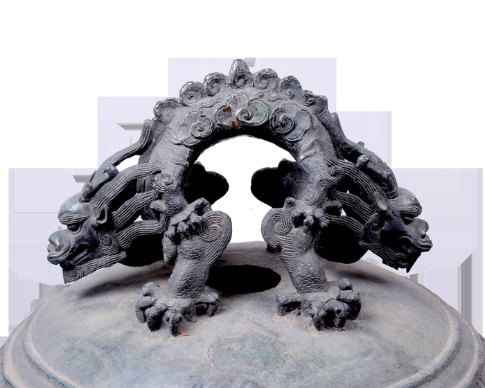 除了覆盖周身的纹饰和铭文,钟钮处的两只蒲牢也是这口铜钟的亮点。中国古代有龙生九子之说,蒲牢就是龙的第四个儿子。相传蒲牢平生好音好吼,原本居住在海边,虽为龙子却一向害怕体型庞大的鲸。当鲸一发起攻击,它就吓得大声吼叫。人们根据其“性好鸣”的特点,即把蒲牢铸为钟钮,而把敲钟的木杵作成鲸的形状。敲钟时,让鲸一下又一下撞击蒲牢,使之响入云霄且专声独远。