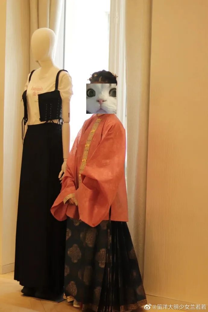本次,一名留学生身穿着中国的马面裙,专门去和巴黎的“马面裙”合了个影;