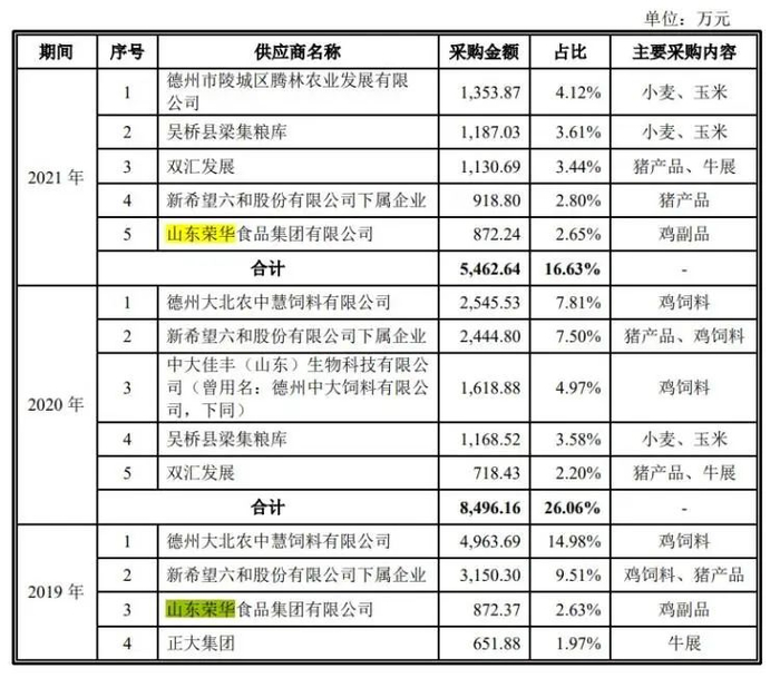 据招股书显示,德州扒鸡的大部分鸡肉原料是公司自养和委托养殖。当这两种来源不能满足生产需求时,会对外采购部分鸡肉。