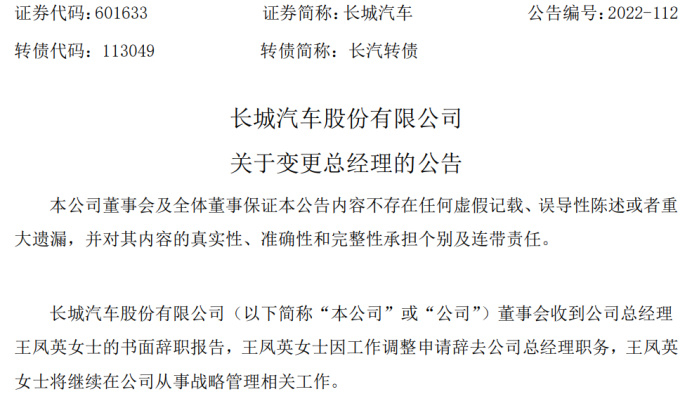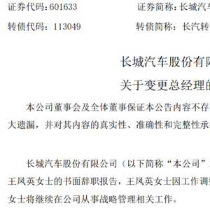 继赫伯特?迪斯官宣辞去大众汽车集团首席执行官职位,将于9月1日正式离职之后,国内有一家汽车巨头也发布了人事变动的公告,也就是长城汽车。近日,长城汽车公告称,公司总经理王凤英因工作调整,申请辞去公司总经理职务,今后将继续在公司从事战略管理相关工作。