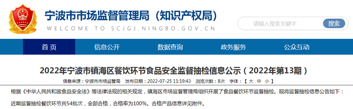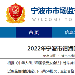 中国质量新闻网讯 2022年7月25日,浙江省宁波市市场监管局网站发布2022年宁波市镇海区餐饮环节食品安全监督抽检信息公示(2022年第13期)。