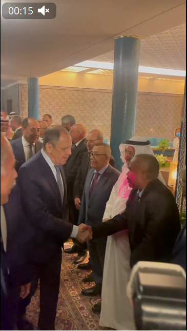 媒体人员拍摄(图的右下角是摄像机)拉夫罗夫在阿盟总部与阿盟成员国代表握手问候,图源:扎哈罗娃24日在Telegram所发布视频的截图