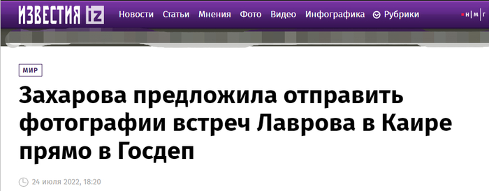 俄《消息报》:扎哈罗娃建议(记者们)把拉夫罗夫在开罗(与阿盟秘书长等)会晤的照片直接发给(美国)国务院