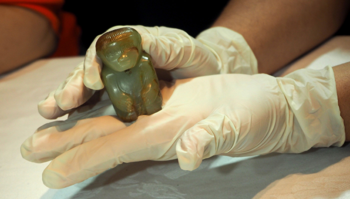 布展中的“跽坐人形玉佩”(商代晚期)