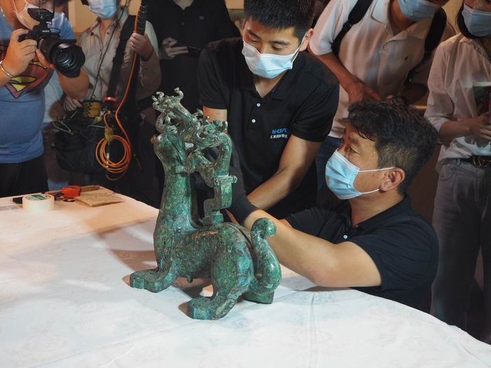 此次布展最繁琐最细致的一件文物当属春秋晚期的镶嵌绿松石神兽。据陈杰介绍,由于这件文物是龙首,虎身,所以学界很难为其准确命名,通常就叫它“神兽”。澎湃新闻在现场看到,神兽造型奇特,制作精致,为龙首,虎颈,虎身,虎尾,龟足。龙张口,吐舌,龙首上又有六条龙……神兽身上镶嵌绿松石,图案有龙、凤鸟、虎、云纹、涡纹等。龙、凤鸟、虎的形象生动。由于神兽造型繁琐,器身分成了四个部分,工作人员现场细致拼搭近半个多小时,才完整呈现其造型。