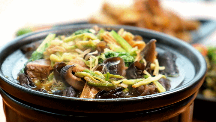 斋菜煲,海南民间传统菜,更是海口人的“归属感”美食之一。芹菜、蘑菇等素菜经过翻炒,放入砂锅中加入骨汤煮开,然后加入各种荤食,如牛杂、牛腩等,最后配上专属的什锦酱,香飘四溢,吃一口就忘不了!