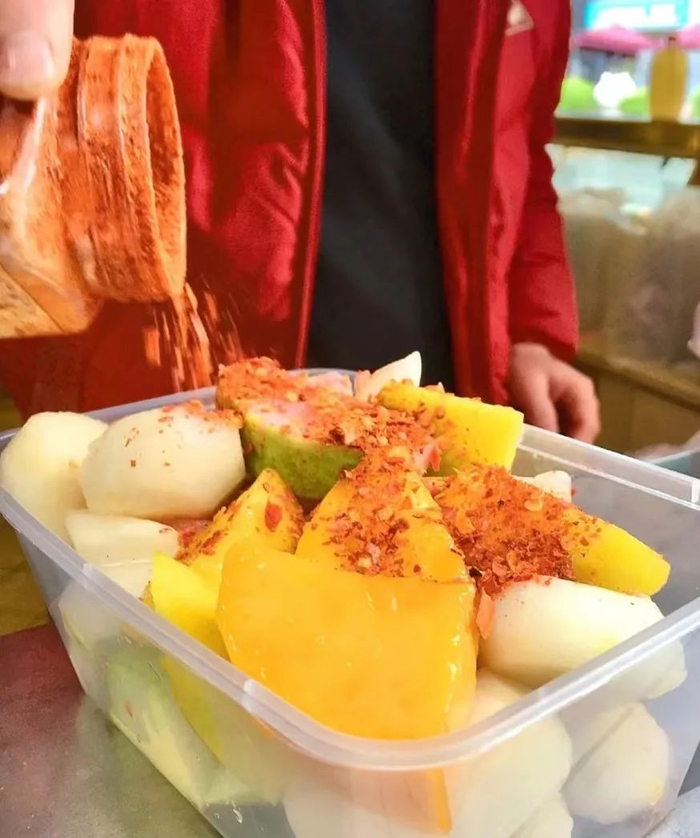 水果辣椒盐,海口最fashion的走街单品。新鲜的芒果、菠萝等撒上辣椒盐之后,又酸又甜又辣又咸,很奇妙的味道。
