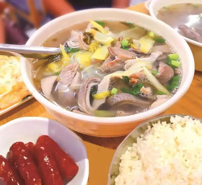 一碗辣汤用白胡椒和各色猪杂以老火熬炖而成,再加上酸菜、葱花提香,喝上一口,微微的辛辣在你喉咙中跳跃,胃口大开。再配上喷香的米饭,好吃到哭!记得加腊肠和煎蛋哦~