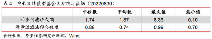 我们筛选全市场所有中长期纯债型基金,剔除非初始类、2022年成立以及数据有缺失的基金,最终得到1383只样本。对样本在过去一年中(20210630-20220630)的久期进行测算,由于两步过滤法久期整体上优于Lasso法久期,因此下文采用两步过滤法来计算,同时为保证研究的科学性,将结果中拟合优度小于0.7的数据予以剔除,以便下文更进一步的分析。
