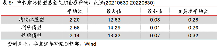 通过持仓券明细和产品信息,我们将中长期纯债型基金按照配置策略分为三组,分别是利率债型、信用债型和均衡配置型。从整体情况看,在过去一年中,以利率债为主要券种的中长期纯债基金的久期平均数为2.56,高于信用债型久期平均数2.14,均衡配置型久期则介于二者之间。从波动性来看,利率债型基金久期的变异度最低,说明相较均衡配置型和信用债型来说,利率债型基金经理对久期的配置更加稳定。
