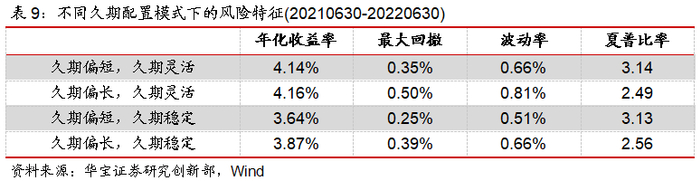 综合来看,收益方面,过去一年中收益表现突出的配置模式是久期偏长、久期灵活的风格。一方面,利率和债市较为震荡,明显更适合灵活配置策略。另一方面,偏长的久期在承受更大风险下,获得了更高的回报;风险方面,久期灵活的基金最大回撤整体上较大。但久期偏短、久期灵活的回撤略优于久期偏长、久期稳定的回撤,可能是由于短久期基金流动性较好,一定程度上压缩了风险;风险收益比方面,久期偏短、久期灵活模式基金和久期偏短、久期稳定模式基金在过去一年中的夏普比率均表现优异,前者得益于较高的收益,后者得益于较低的风险。