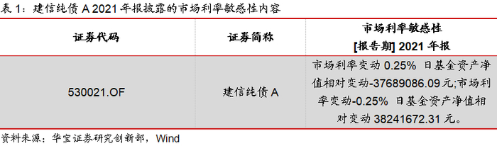 要了解基金真实的久期情况,最理想的方式是获悉组合的全部持仓债券,再通过上文中提到的公式算得组合久期,但这种方法在实际中并不可行,主要原因是因为基金定期报告中只披露前五大重仓债券,并不披露全部持仓债券信息。目前我们能够跟踪基金久期的重要渠道是通过基金的半年报和年报中披露的市场利率敏感性的内容,比如下表中就展示了纯债型基金建信纯债A在2021年报中所说明的基金资产净值相对变动对应市场利率变动的信息。