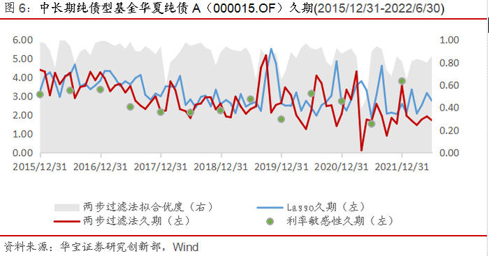 我们以一只中长期纯债型基金华夏纯债A(000015.OF)为例,在统计区间内(2015/12/31-2022/6/30),Lasso法测算出的久期平均长短为3.17,两步过滤法测算出的久期平均长短为2.76,实际利率敏感性久期为2.60。可以看出两种基于净值方法测算出的久期与半年报所披露的利率敏感性久期在数值上并不是精确相等的,但趋势上呈现出一致的态势,只要大致的方向得到有效性验证,我们就可以通过月频跟踪的方式来洞悉基金经理对市场利率走势的判断以及仓位操作动向,进而评估基金经理对未来市场的观点。