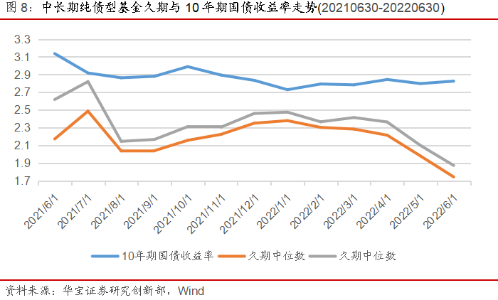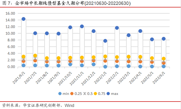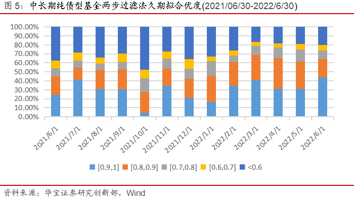 我们筛选所有中长期纯债型基金,主要采用两步过滤回归法来高频观察过去一年(20210630-20220630)市场的久期特征: