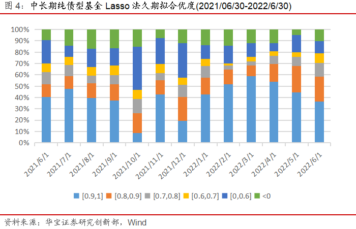 我们分别通过Lasso回归和两步过滤回归来测算全市场中长期纯债型基金的久期,进而得到拟合优度数据。在统计区间内(2021/06/30-2022/6/30),Lasso回归模型每月拟合优度中位数的平均值为0.83,大多数样本均获得了较为有效的拟合值,但是或多或少存在负R^2的情况,说明此时模型出现问题,对应的久期值应当不予考虑。
