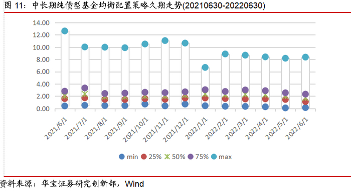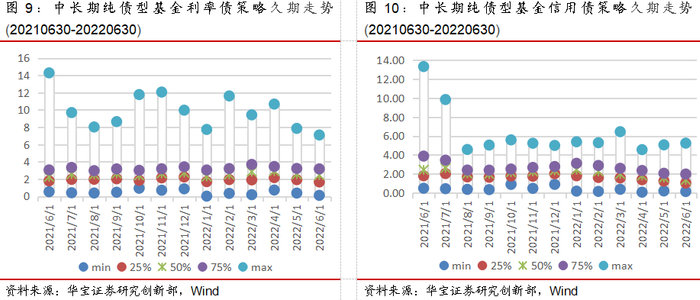 从全市场中长期纯债型基金的久期来看,策略操作分化明显。多数中长期纯债型基金的久期分布在4以下,中位数始终在3上下波动。但端点值差异较大,最大值分布于[7.5,14.5]之间,最小值则在0附近,可以看到在各个时期均有少数较为激进的基金选择长久期策略,说明这些基金经理对后市利率走低的确定性极高,试图通过大幅拉长久期来博弈更大的收益;而其他大部分基金经理则偏稳健,更多以适当的久期来应对利率风险,较少为追求基金净值增长而选择极长久期。