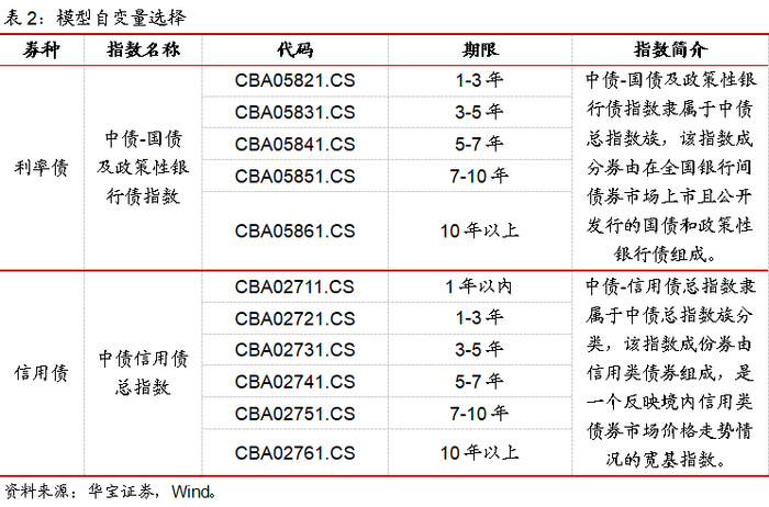变量选择:为了模拟基金的真实持仓,在选择自变量债券指数时不仅要考虑不同券种,也要考虑不同期限,尽可能囊括市场上的债券品种。具体操作中,我们选择各期限利率债和信用债指数,详细见表2。