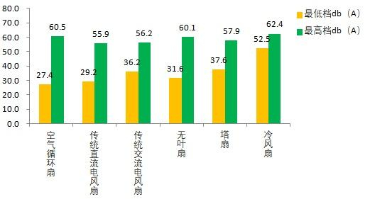 风扇最低档相对最静音,而最高档则噪声最大。测试结果显示,最低档噪声最小的是空气循环扇,得益于直流电机档位多,而冷风扇噪声较大。最高档噪声最小的是传统风扇,此类风扇经过多年改进,大都采用了多扇叶,使得噪声降低很多,最高档噪声较高的仍是冷风扇。