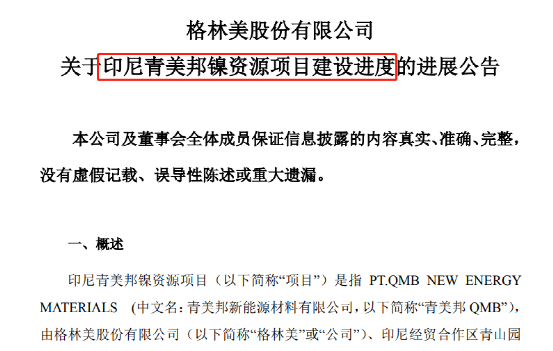 7月24日晚,格林美还公告了总投资近10亿美元的印尼青美邦镍资源多方合作项目的进展。