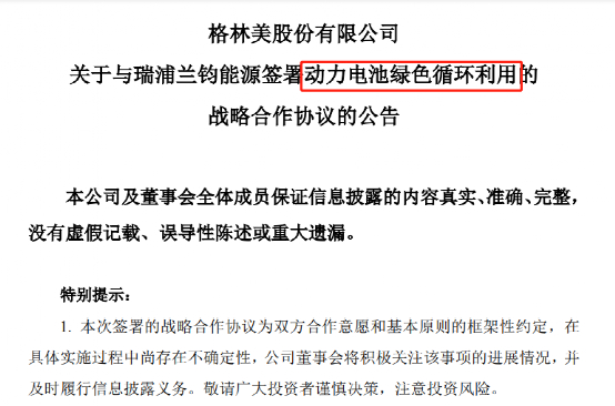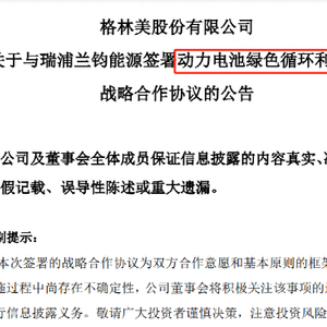 格林美称,为满足全球绿色供应链的要求,解决动力电池的污染问题,推动新能源产业从“绿色到绿色”,格林美、瑞浦兰钧能源股份有限公司(以下简称“瑞浦兰钧能源”)决定联合各方优势,于2022年7月24日共同签署《关于动力电池绿色循环利用的战略合作框架协议》。