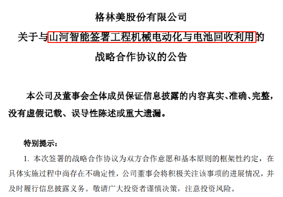 同在7月24日,格林美、山河智能“决定联合各方优势”,签署《关于在工程机械电动化与电池回收利用的战略合作协议》,共同打造动力和储能用锂离子电池闭环产业链,推动动力电池梯级再利用的商业化,“抓住工程机械电动化的市场机遇,探索全球新能源产业绿色发展的典范模式”。