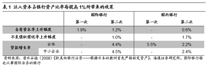 三是政府向金融机构注入流动性以应对不良负债问题。根据BIS的报告《1990 年代日本的金融危机:日本银行如何应对和吸取的教训》,1998年3月,日本政府对21家银行注入了总额约1.8万亿日元的资本。1999年3月,又对主要的15家银行再次注入了总额约7.5万亿日元的资本金,其中6.2万亿元采取优先股形式,以使政府加强对受困银行的管控能力。被注资的银行包括樱花银行、第一劝业银行、富士银行、三井住友银行、三和银行等日本最主要的大型银行。接受救助的银行,需要接受严厉的整改以提高经营水平,为了达成经营目标,日本的大中型银行在1999-2000年开始大规模合并重组。根据清水谷谕(2008)的报告,第二次注资后,无论国际银行还是国内银行,注资都使得其经营水平改善,加速了不良债权的偿还,特别是促进了向中小企业放贷。