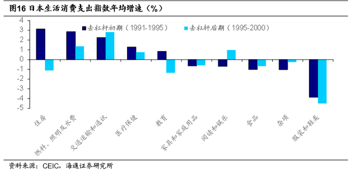 从消费角度看,大众消费兴起。无论在去杠杆的初期(1991-1995年)还是后期(1995-2000年),交运和通讯、医疗保健等消费均能保持较高的正增长,而在后一阶段,阅读与娱乐消费也开始出现了正增长。从消费风格来看,根据人民网援引中国青年报,日本著名经济评论家大前研一提到,在泡沫经济破灭后,日本进入了“低欲望社会”。消费理念转向简约化、本土化,例如,以711、全家为代表的便利零售业快速发展,以优衣库、无印良品、大创等为代表的优质平价品牌崛起,本土消费电子产业如索尼、夏普等厂商也有新的发展。