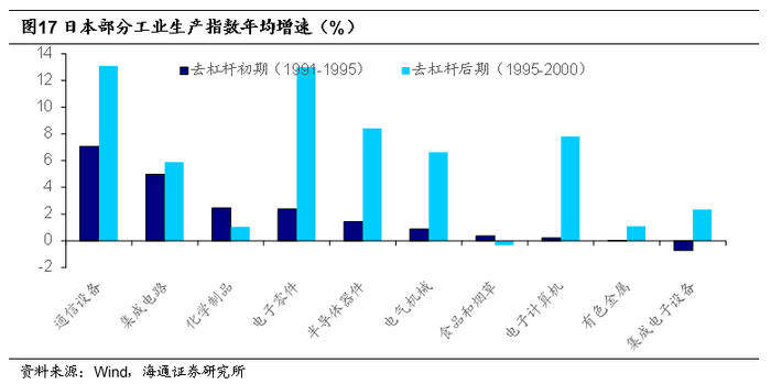 从生产角度来看,虽然制造业整体的生产增速常年低于1%,但电子设备、电气机械、交运设备等行业发展迅速。从工业生产指数来看,日本的部分行业生产增速在泡沫破裂后,仍能保持较高水平,而且在去杠杆的后期(1995-2000年)增速又进一步提高。例如电子设备和电气机械等优势行业,虽然出口减弱,但随着消费本土化转向内需主导。又例如运输设备,其部分受益于日本政府积极扩大财政支出,投资于铁路公路等基建项目,这带动交运行业的快速发展。