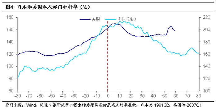 一般来说,在资产泡沫膨胀的阶段,私人部门大幅加杠杆;在资产泡沫破灭阶段,私人部门去杠杆。例如在美国07年之前房地产泡沫膨胀阶段,私人部门的杠杆率从2002年Q1的141%上升至2007年Q4的169%,提高了28个百分点;而在2007年泡沫破裂后,美国私人部门杠杆率迅速下降。