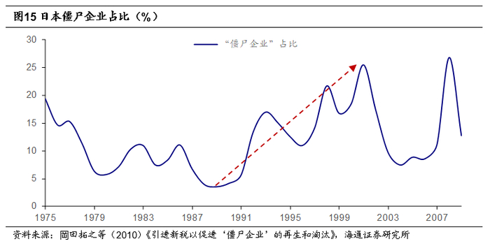 投资增速也明显放缓。日本私人企业设备投资的平均增速从1985-1990年的11.4%,下降至1990-1995年的-0.3%。日本在90年代出现了较多的“僵尸企业”,根据岡田拓之等(2010)援引日经NEEDS、中村和福田(2008)的数据,僵尸企业占比,从1989年的3.6%迅速上升至1992年的13.5%,并且在之后的十年中始终保持10%以上的占比,在2001年,“僵尸企业”的占比一度高达25.5%。“僵尸企业”的存在,对生产和投资都会构成限制。