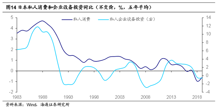 从需求端看,无论是消费还是投资,在房地产泡沫破裂后,增速中枢均明显下移。从1993年起,日本家庭可支配收入的平均增速长期处于2%以下,且在1998-2003年维持负增长。对未来收入的预期偏悲观,家庭财富的缩水,日本居民的消费意愿明显走低。日本私人消费从1985-1990年的4.6%,下降至1990-1995年的2.1%。