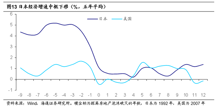滞后而缓慢的去杠杆,再加上人口结构的变化,日本经济增长中枢在房地产泡沫破灭后出现了长期的下移。泡沫破灭前十年的平均增速为4.6%,而在泡沫破灭后,经济增速中枢下移至0.4%。之后日本长期处于低速增长阶段,被称为“失去的二十年”。而对比来看,美国的增速中枢在泡沫破灭前后十年,分别为1.0%和0.5%,并未出现明显改变。