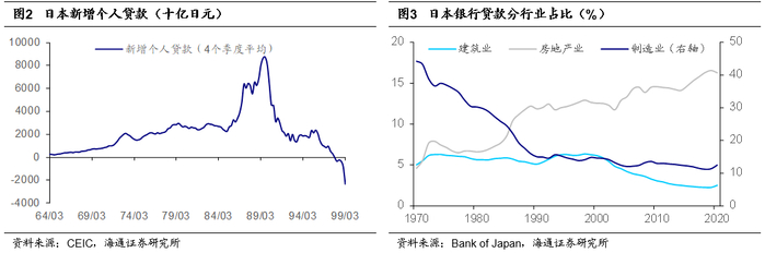 在日本房地产泡沫的膨胀阶段,居民和企业积极加杠杆、购地购房。从居民角度来看,贷款的主要目的就是为了购房,日本新增个人贷款在1989年一度超过30万亿日元,而在1984年这一数字仅为10.7万亿日元。从企业角度来看,非金融和金融企业持有的土地资产占土地总资产的比重,在1985-1990年迅速提高,这说明在这泡沫膨胀阶段,企业大量投资于土地。从借款的银行角度来看,日本的银行贷款中,投向房地产业的占比,从1984年的7.7%迅速上升至1989年的12.2%,而投向制造业的比重却出现明显下滑。