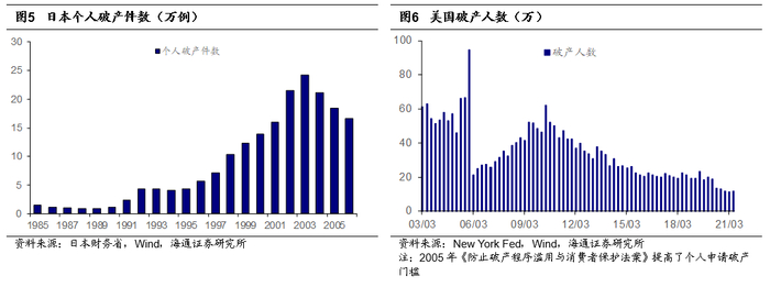 从居民部门来看,1991年房地产泡沫破裂后,日本个人破产案件数的最高峰是在2003年,中间相隔了十多年。对比来看,美国在房地产泡沫破灭后,在2011年个人破产的案件数就达到了最高峰,中间只相隔了4年。