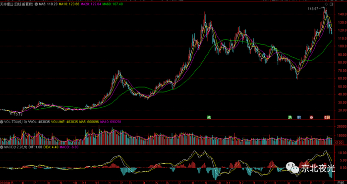 但天齐锂业这论周期的股价峰值143元,是上轮股价峰值60元的2.4倍左右,目前天齐锂业股价下滑到66元,比上轮股价峰值高了10%,比上轮周期股价顶部中枢50元高了30%。