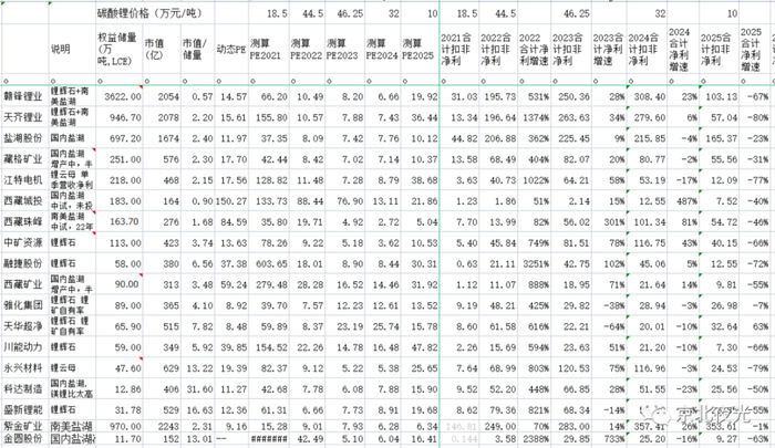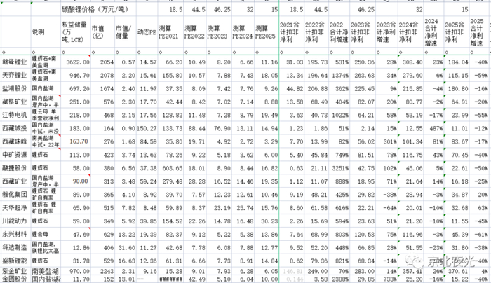 大龙赣锋锂业19PE,二龙天齐锂业 36PE,盐湖提锂老大盐湖股份 10PE,藏格矿业 10PE,江特电机 38PE,西藏城投 21PE,西藏珠峰 5PE(权益权益),科达制造 15PE,中矿资源 10PE,融捷股份 30PE,西藏矿业 31PE(不是PPT锂矿了),天华超净 15PE,川能动力 47PE,永兴材料 25PE,雅化集团 11PE,盛新锂能 19PE,金圆股份16PE。